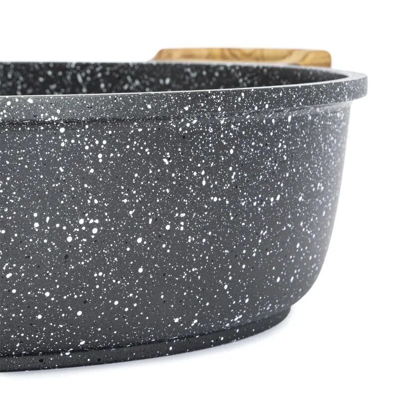 This pan isn’t just about cooking; it’s about bringing joy and ease to your kitchen routine. The non-stick surface ensures your food cooks perfectly without sticking, making both cooking and cleaning a breeze. The glass lid allows for convenient monitoring of your dishes, saving you from the hassle of constantly lifting the lid to check progress. Its unique charcoal speckle design, complemented by olivewood accents, adds a touch of elegance to your kitchen décor, making it more than just cookware – it’s a statement piece.
