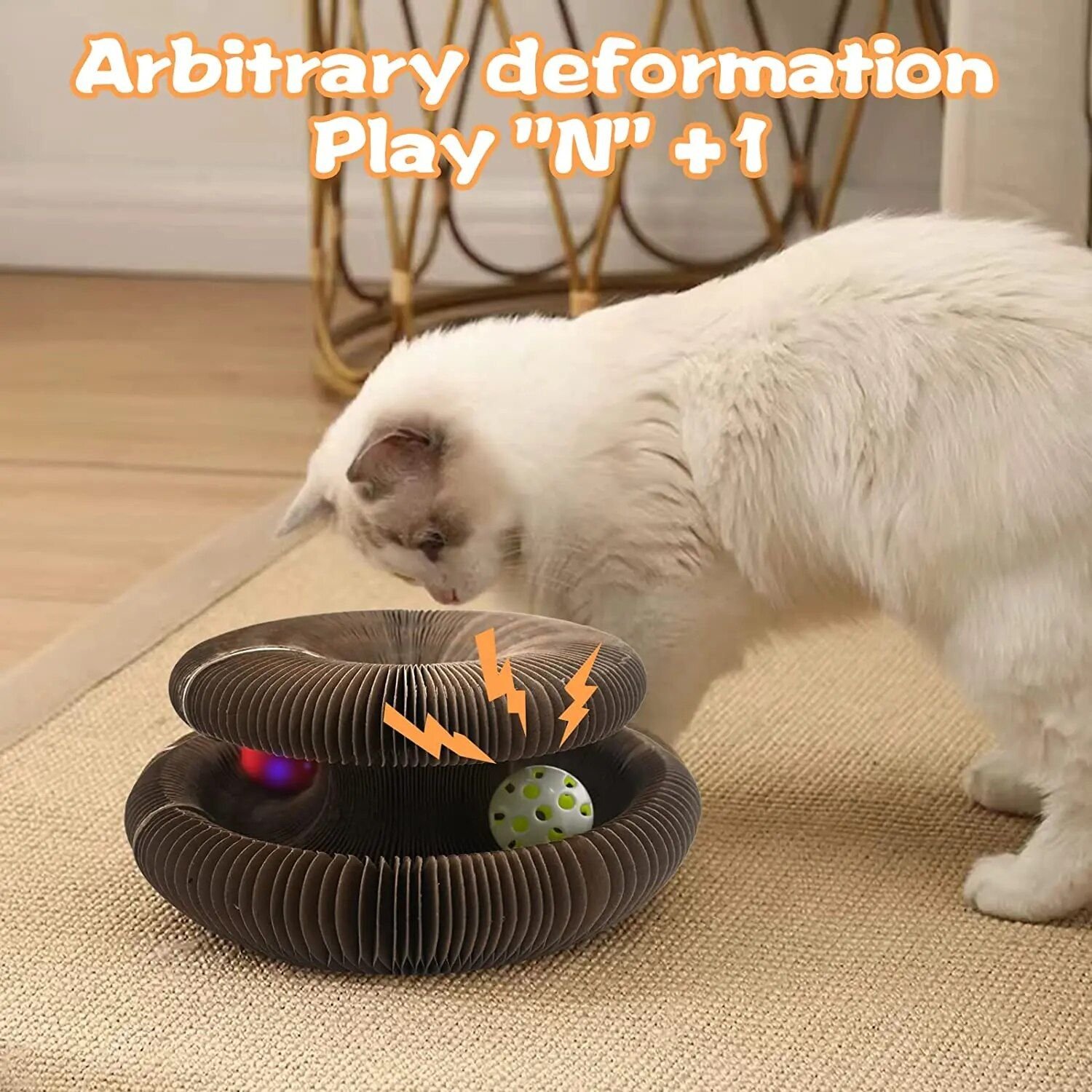 Unlike standard scratch boards, this product integrates the joys of multiple toys into one. The inclusion of a Ball Bell ensures it’s not just another scratcher – it’s a play station. Its unique deformable and retractable feature means the toy never gets old; it changes and evolves, ensuring your cat’s curiosity remains piqued.