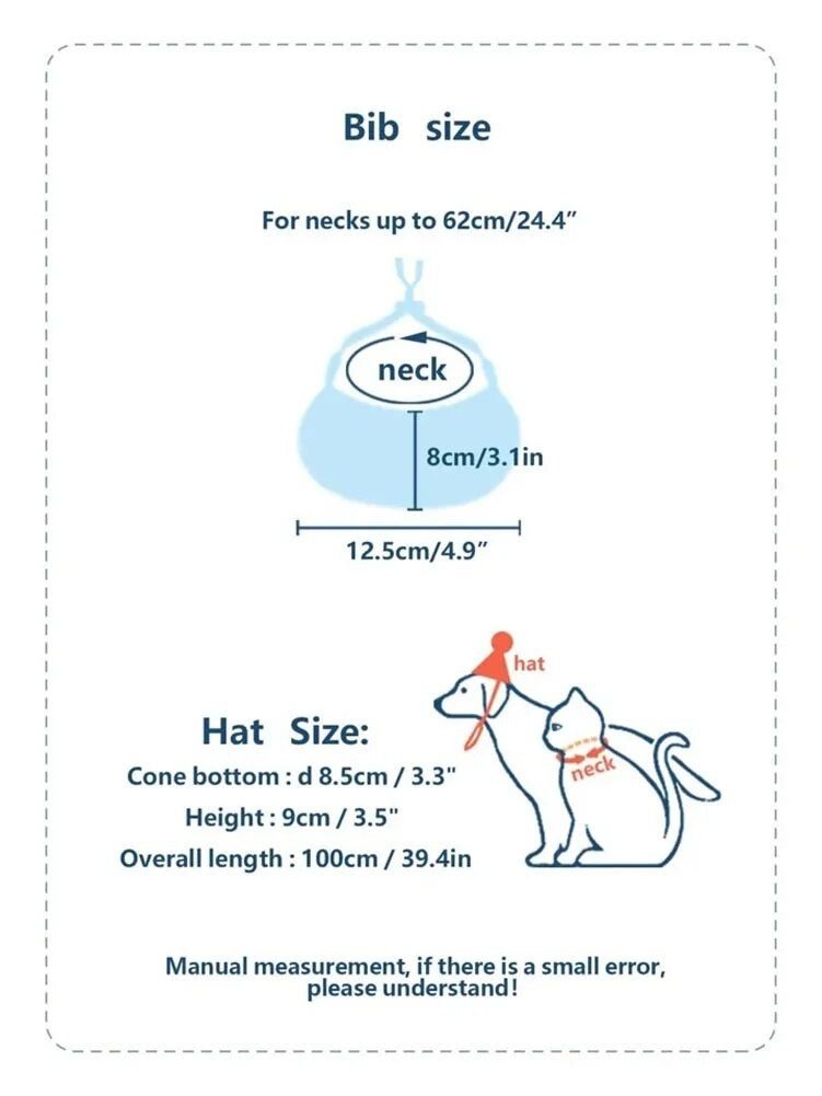 - Adjustable Design: The triangular bandage fits comfortably around your pet’s neck, while the hat stays securely in place.