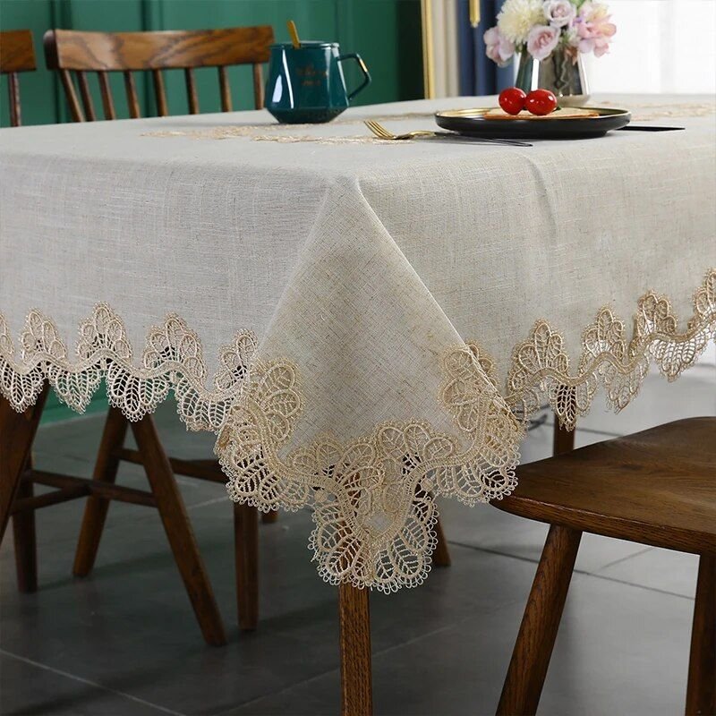Crafted from a premium blend of 20% linen and 80% polyester, this tablecloth strikes the perfect balance between durability and elegance. The fabric is soft to the touch, yet robust enough to withstand regular use. The embroidered lace detailing adds a touch of luxury, making it an ideal choice for both casual and formal settings.