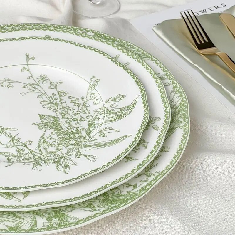 Elevate your dining experience with our Elegant Jade Green Lily of the Valley Porcelain Dining Plate. Meticulously crafted to bring a touch of European sophistication to your table, this exquisite plate combines the timeless beauty of nature with the elegance of high-end design. Its leaf pattern, inspired by the delicate Lily of the Valley, adds a serene and organic touch to any meal.