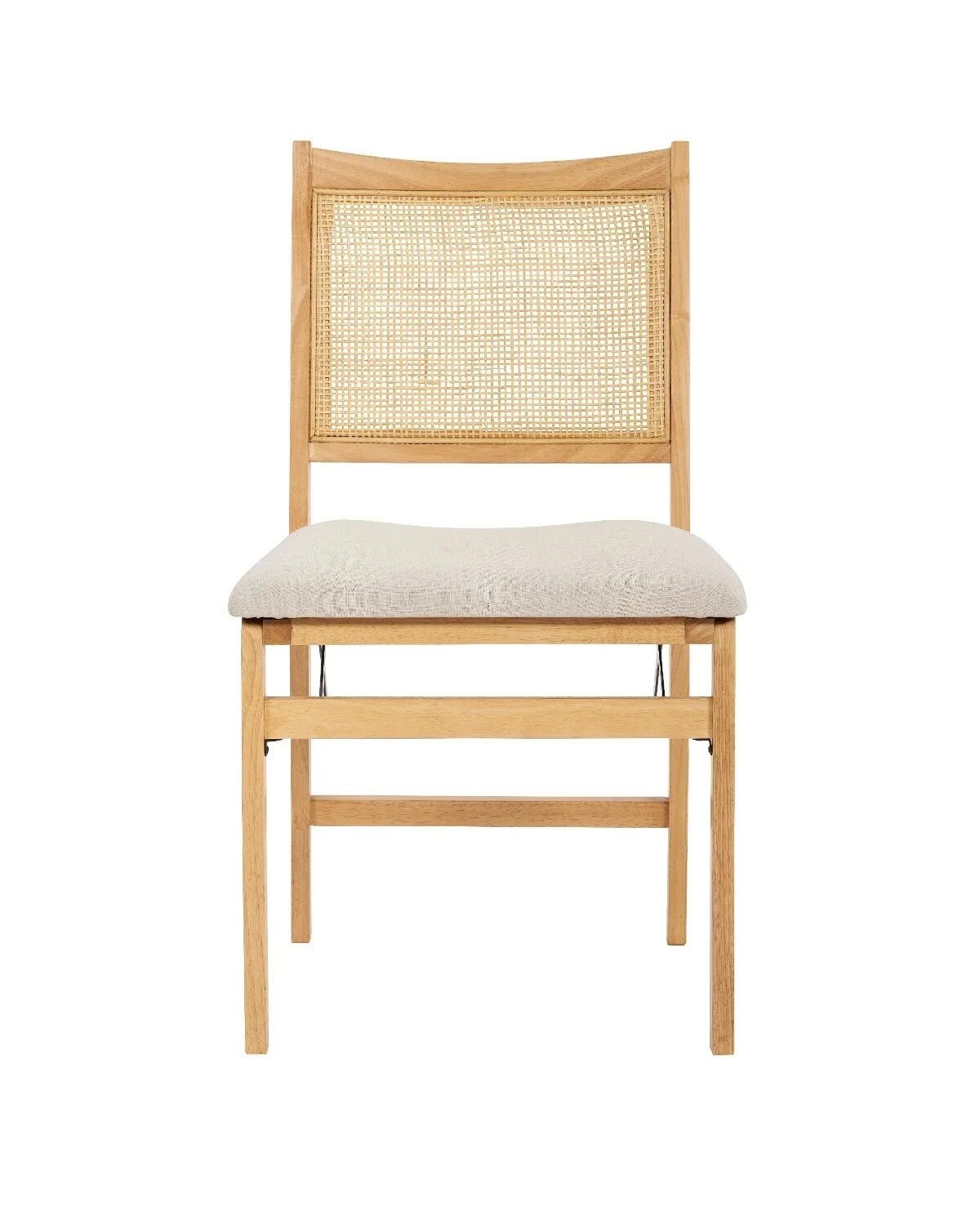 Elegant Natural Wood and Rattan Folding Chair with Upholstered Beige Seat