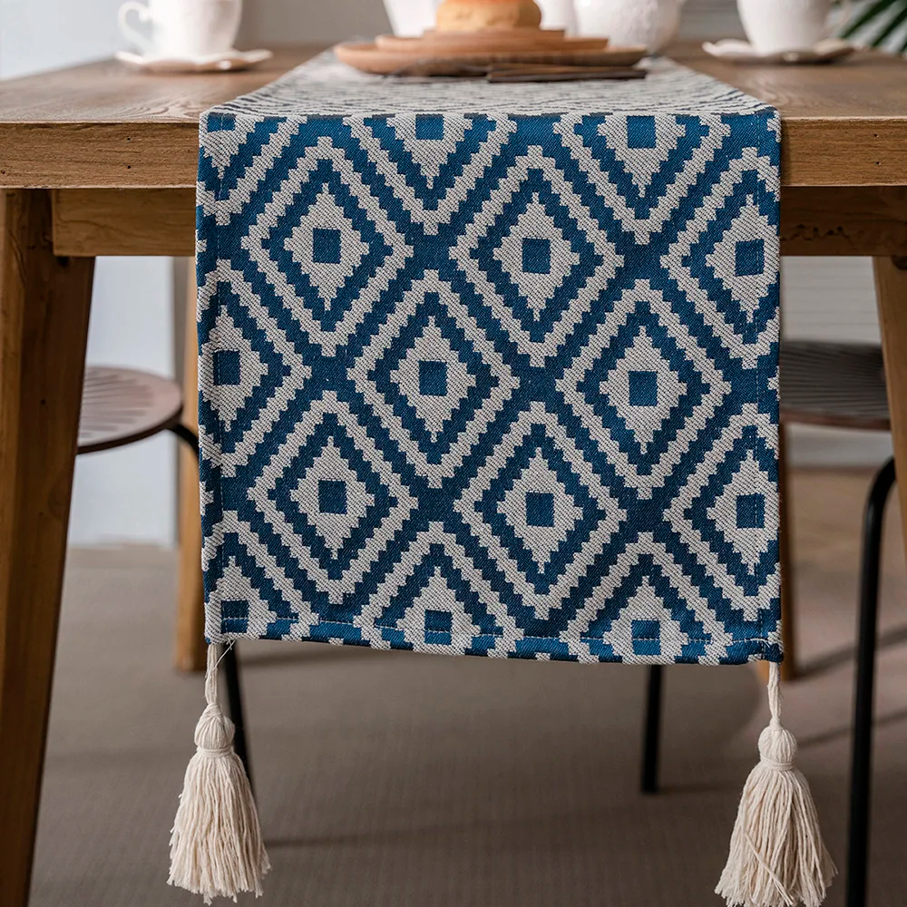 Elegant Nordic Jacquard Table Runner with Geometric Tassel Design