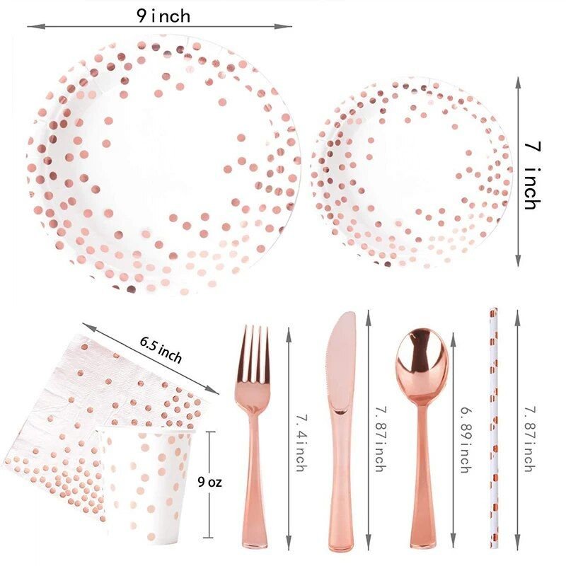 Apart from its stunning rose gold design that instantly elevates your party’s decor, this tableware set stands out for its commitment to quality and sustainability. The durable cowhide paper material ensures a sturdy dining experience without compromising on environmental responsibility. Moreover, the customization feature allows you to add a personal touch to your celebration, making each event uniquely memorable.