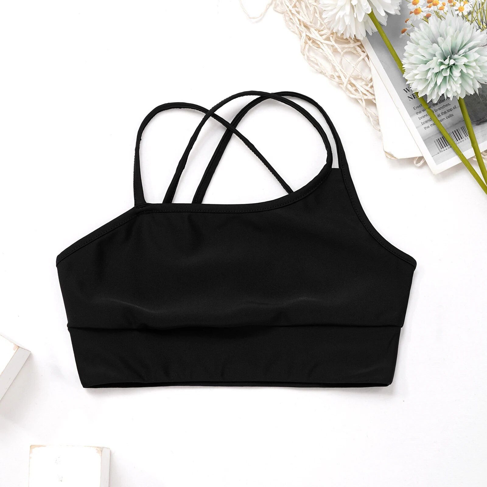 - Unique Design: The asymmetrical spaghetti shoulder straps add a trendy twist, while the elastic hem ensures the top stays in place during high-energy routines.