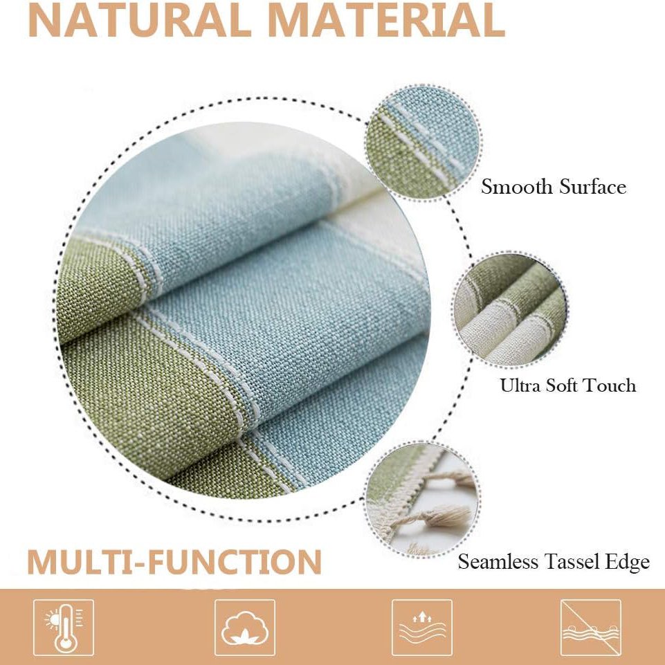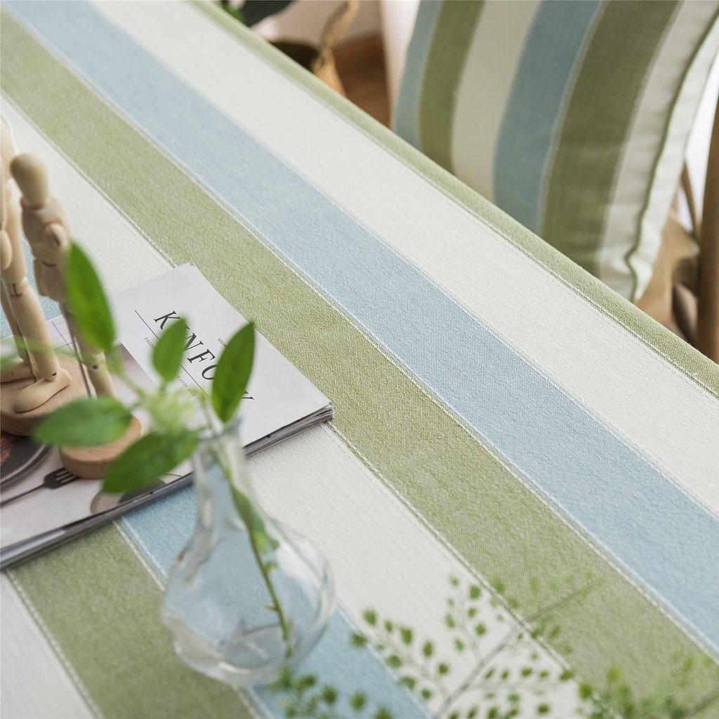 This tablecloth is not just about looks; it’s about making life easier. The waterproof and oilproof features mean less worry about spills and stains. Its durable material withstands regular use and washing, ensuring a long-lasting addition to your decor. The green striped pattern is not just printed; it’s a part of the tablecloth’s weave, ensuring the design remains intact through washes and use.