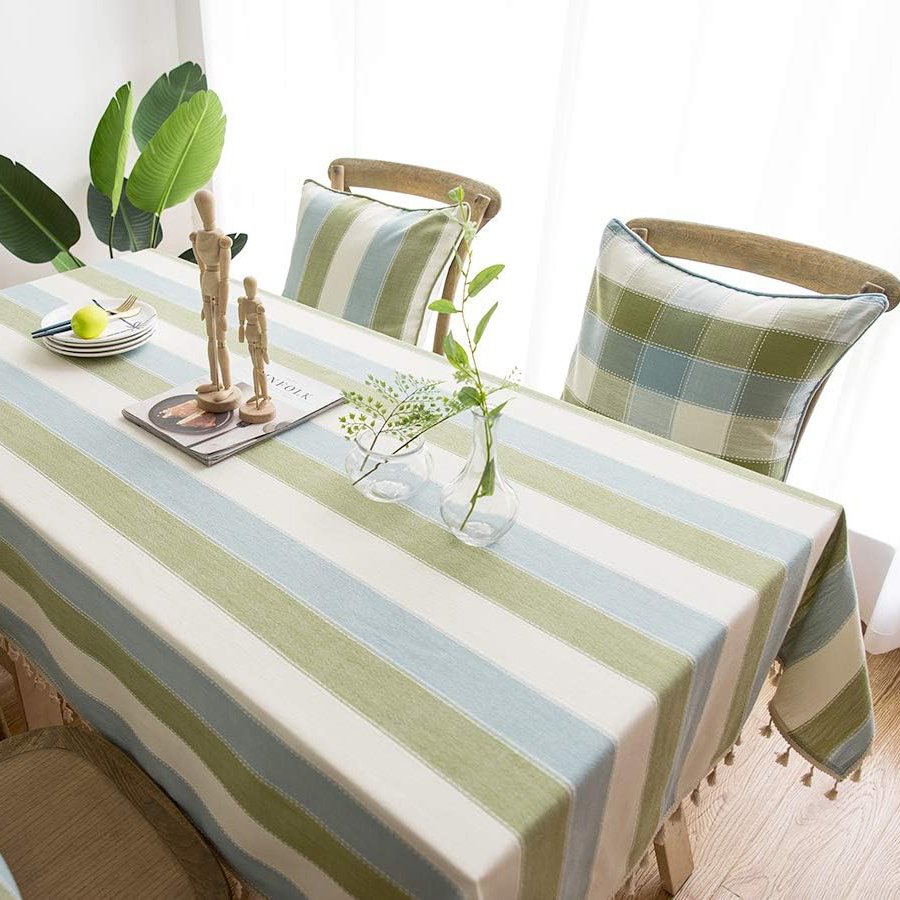 Green Striped Cotton Linen Tablecloth with Tassel Hem