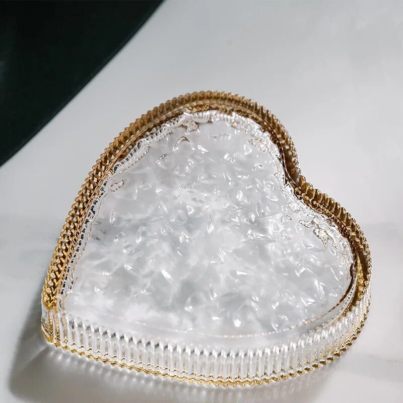 Introducing our exquisite heart-shaped glass plate, a symbol of elegance and versatility. Crafted with meticulous attention to detail, this plate is not just a dish but a statement piece that enhances any table setting or vanity. Its unique love heart shape, complemented by a luxurious gold rim, brings a touch of romance and sophistication to your dining and decor experience. Whether you’re serving a delectable dessert, organizing your precious jewelry, or simply seeking an eye-catching incense tray, this plate promises to elevate the ambiance with its timeless charm.