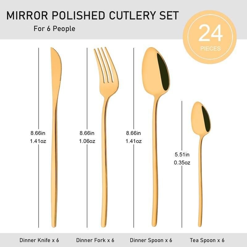 Luxurious 24-Piece Mirror Gold Dinnerware Set, 18/10 Stainless Steel Cutlery