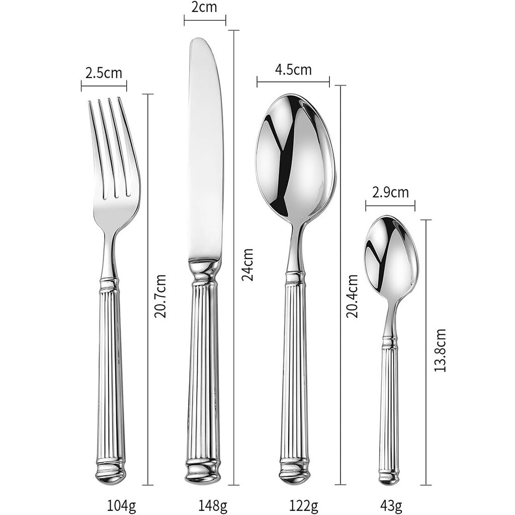 The set includes a 24cm Dinner Knife, a 20.3cm Dinner Spoon, a 20.7cm Dinner Fork, and a 13.7cm Tea Spoon. Each piece is ergonomically designed for balance and comfort, making your dining experience delightful.