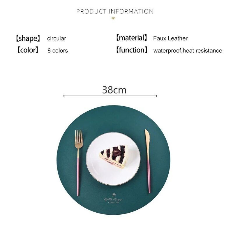 Our placemats are crafted from high-quality PU artificial leather, ensuring durability and elegance. The round shape, combined with the modern style, complements any table setting, while the eco-friendly and stocked features make it a guilt-free addition to your home. The placemats, measuring 38 × 38cm, are perfect for all table sizes.