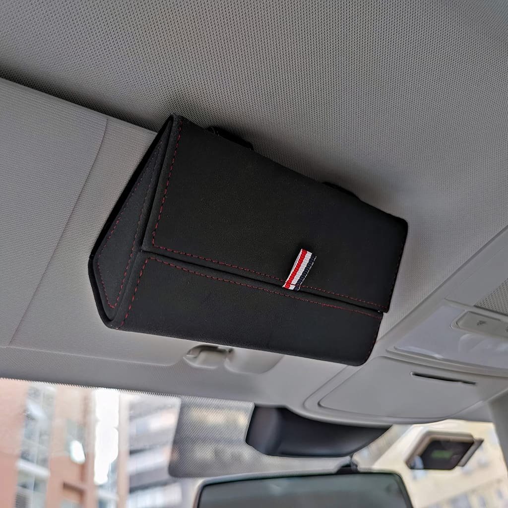 This is a very nice glasses case for my car. The leather appears to be good quality and the stitching is excellent!! The case fits snug to my sun visor with no slippage at all and the magnetic latch holds my glasses securely in place. I wear aviator style glasses and the case will hold two pairs of my glasses (sunglasses and night driving glasses) without the magnetic latch releasing. For me, one of the features I really like is the black leather case and red stitching match the interior of my 2018 Nissan 370Z Nismo. I wish I had bought an additional case for the passenger side for my wife’s glasses…… GOOD PRODUCT!!!