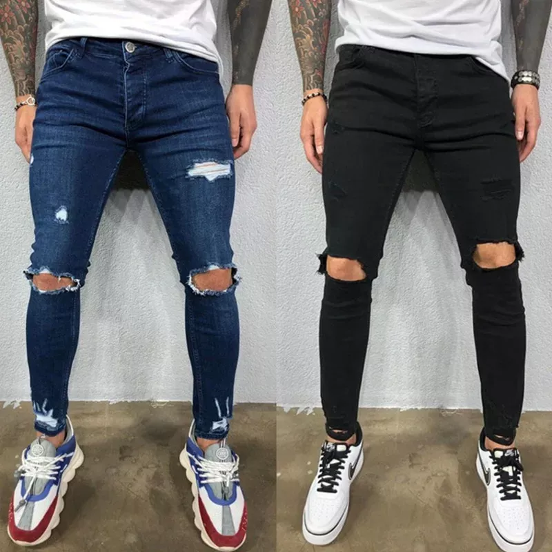 Stretch Skinny Ripped Knee Jeans for Men in Black & Blue
